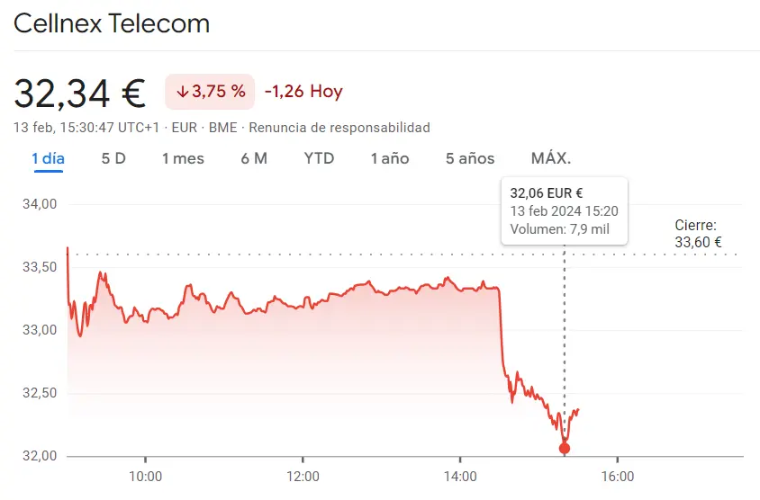 Gráfico de las cotizaciones de las acciones Cellnex del Ibex 35 hoy