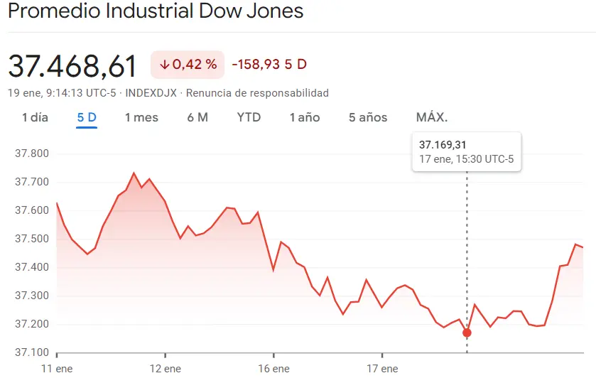 Índice Dow Jones en descenso: se sitúa en 37,468.61 puntos, registrando una disminución de 158.93 puntos y sin señales de alzas