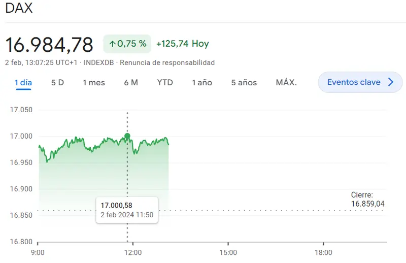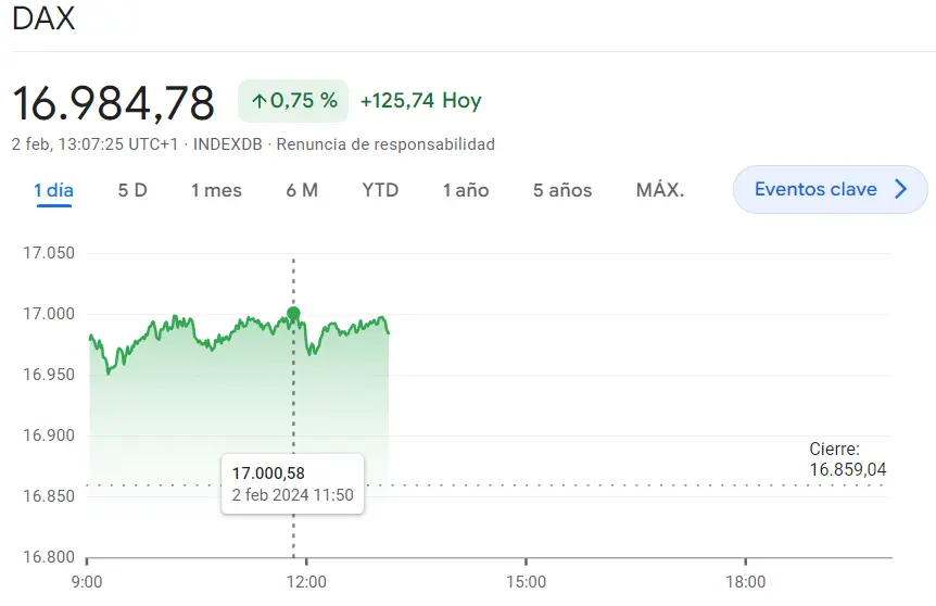 Gráfico de las cotizaciones del índice DAX 30 en un espacio de tiempo de un día