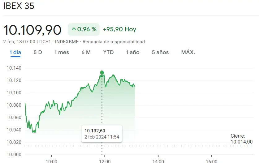 El mercado español perteneciente al mercado europeo, nos deja sin lugar a duda ante unos valores brillantes, con unas subidas que en estos instantes cotizan unos 10109.9 dólares (USD), elevándose el índice español de la Bolsa de Madrid en un porcentaje del 0.96%, con un crecimiento de unos 95.9 puntos por el índice. Si nos fijamos mejor en lo que ha sido hoy del activo español, podemos observar unas cotizaciones con cierres de sesión en unos 10014 puntos, subiendo ahora mismo desde las cotizaciones mínimas de unos 10035 puntos, hacia unas cotizaciones de máximos muy marcados de unos 10132.6 puntos.