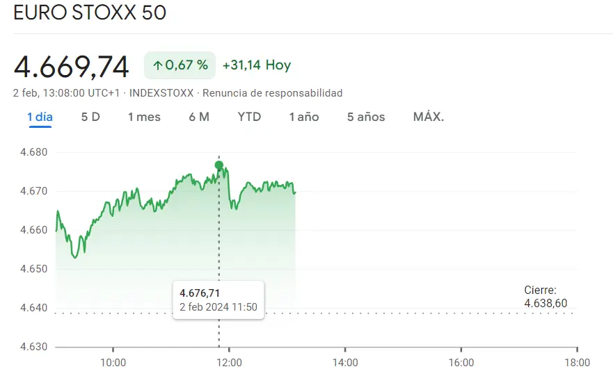 El índice Euro Stoxx 50 es uno más de los activos europeos más fuertes de estos momentos. La sesión de hoy nos muestra como febrero arranca fuerte con pasos firmes y alcistas como los de unos 31.14 puntos por el índice, elevándose para el momento actual por cotizaciones tan fuertes como las de unos 4669.74 puntos por el índice, subiéndose unos valores exactos de un porcentaje de un 0.67%. El día de hoy, las cotizaciones del activo europeo siguen por encima de las cotizaciones de los cierres de sesión propios de unos 4638.6 puntos.