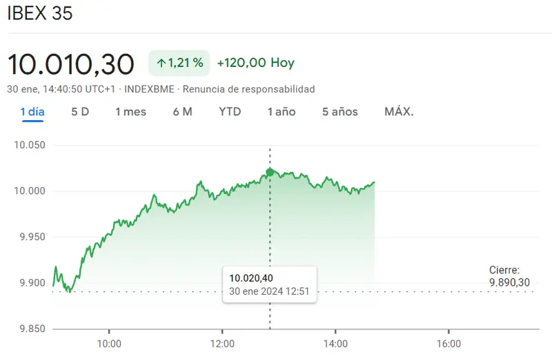 Las cotizaciones del índice Ibex 35 han experimentado un notable ascenso, exhibiendo valores altos cercanos a los 10010.30 puntos y continuando con una tendencia al alza que podría anticipar posibles direcciones en las próximas sesiones. En la actualidad, se observa una subida del 1.21%, lo que representa una subida de 120 puntos, llevando las cotizaciones a alrededor de 10010 puntos. Este ascenso se manifiesta desde el mínimo alcanzado en los 9890.3 puntos. A lo largo de la sesión de hoy, los valores se han mantenido consistentemente por enicma de los cierres anteriores, situados en aproximadamente 9890.30 puntos.