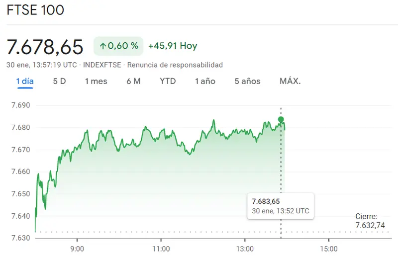 Gráfico de las cotizaciones del indice FTSE 100 en un espacio de tiempo de un dia