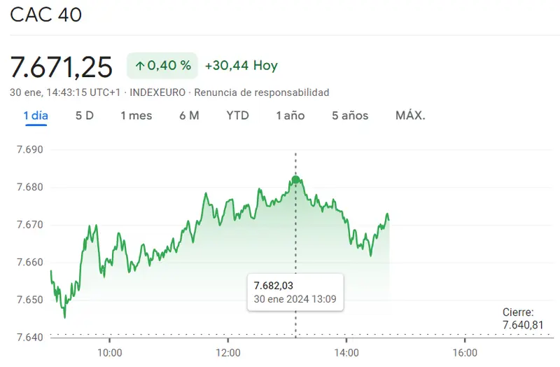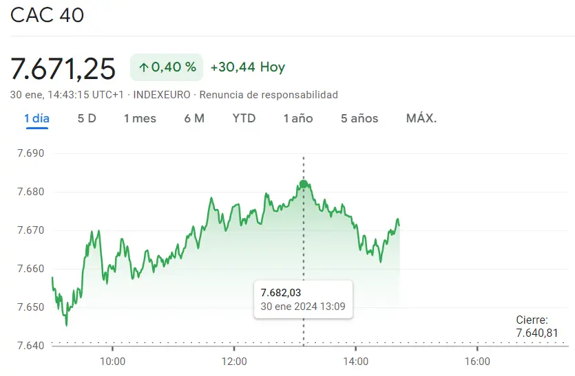 Gráfico de las cotizaciones del indice CAC 40 en un espacio de tiempo de un día