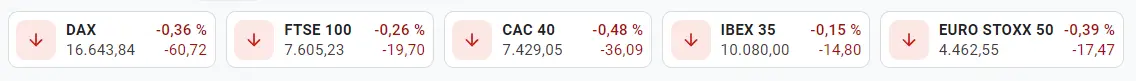 Tabla con las cotizaciones de los índices europeos en un espacio de tiempo de un día