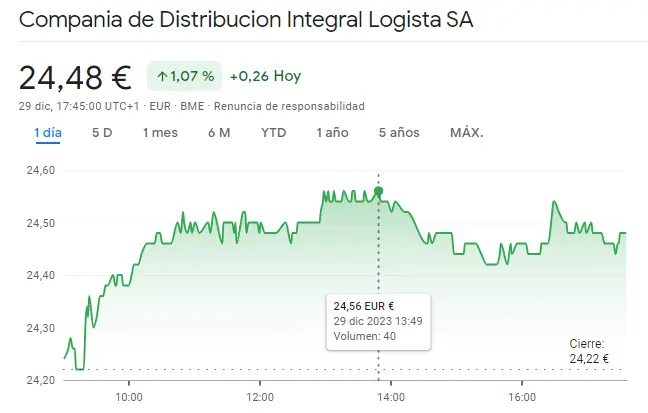 Gráfico de las cotizaciones de las acciones Logista del índice Ibex 35 en un espacio de tiempo de un día
