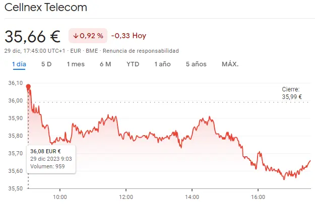 Grafico de las cotizaciones de las acciones Cellnex del índice Ibex 35 en un espacio de tiempo de un día
