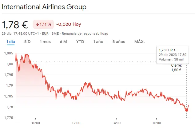 Gráfico de las cotizaciones de las acciones IAG del índice Ibex 35 en un espacio de tiempo de un día