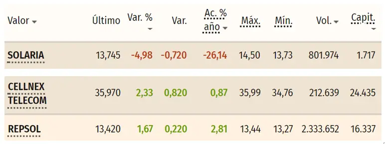 Ibex bajo amenaza; Solaria, Cellnex y Repsol