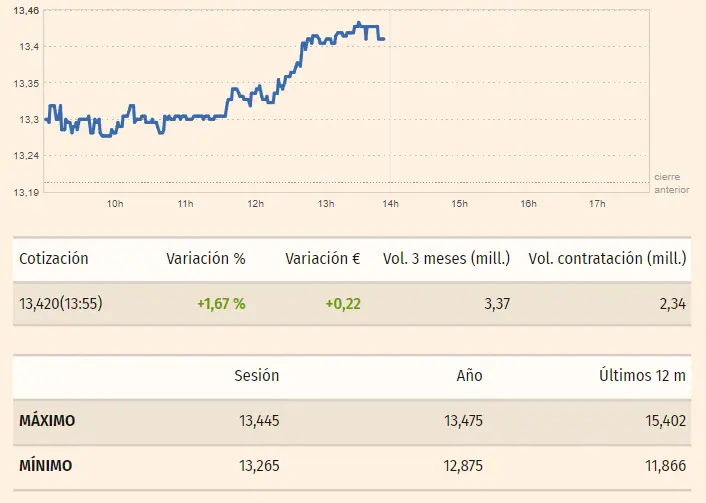 Los valores de las acciones Repsol son los que nos encontramos en unos 13.42 euros de este instante. Las subidas que las acciones Repsol marcan son las de alzas de un 1.67%, elevándose unos 0.22 euros por acción, subiendo a paso muy firme tras partir en valores de unos 13.3 euros por acción. Ahora mismo también nos podemos fijar en las cotizaciones de los cierres de sesión, que observábamos aún en unos valores de 13.19 euros por acción.