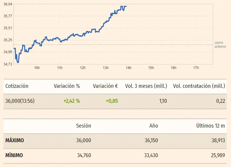 Las cotizacionesde las acciones Cellnex Bolsa del índice Ibex 35 son más que suficientes en los momentos actuales, alzándose un porcentaje muy fuerte, es decir, el de un 2.42%, con unas subidas que representan alzas de unas cotizaciones de 0.85 euro por acción, elevándose a los niveles actuales de unos 36 euros por acción Cellnex. Nos interesa observar que las cotizaciones actuales se acercan mucho a los valores que las acciones Cellnex han encontrado en sus máximos de unos 6 euros.