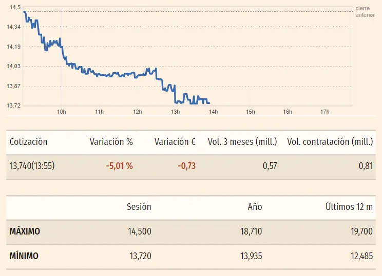 Las acciones Solaria nos ha dejado ante unos valores que no presentan resultados buenos. Lo que observamos en estos instantes son unas caídas que van de más a menos, es decir, desde los valores máximos de unos 14.50 euros hacia las cotizaciones mínimas de unos 13.72 euros por acción, rulando en unos valores del 5.01%, es decir, de unos 0.73 euros por acción. Ahora mismo las acciones Solaria cotizan unos niveles de unos 13.74 euros por acción.