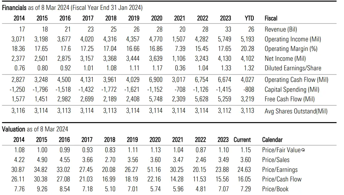 La acción de la empresa cotiza con unos múltiplos de valoración elevados pero que se encuentran alineados con la media de la última década: Precio / Beneficios (Price / Earnings) es de 24,63x, Precio / Ventas (Price / Sales) en 3,60x y Precio / Valor Contable (Price / Book) en 7,29x.