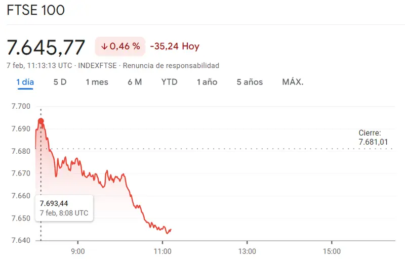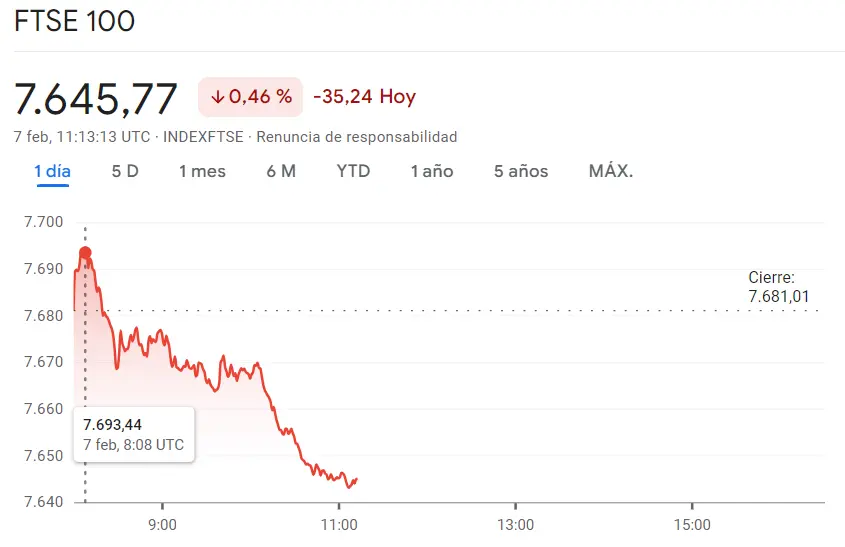 Ahora mismo el índice FTSE 100 es otro más de los índices europeos que encuentran sus valores más bajistas en las cotizaciones más cercanas al momento actual. Lo que ha ocurrido a lo largo de la mañana de hoy ha sido una serie de caídas. Observamos las cotizaciones actuales de 7645.77 puntos, que hacen un gran contraste con las cotizaciones máximas de 7693.44 puntos, y algo menos contraste con las cotizaciones mínimas que hemos encontrado en unos 76435 puntos. Los cierres de la sesión de ayer nos han dejado unos valores de 7681.01 puntos.