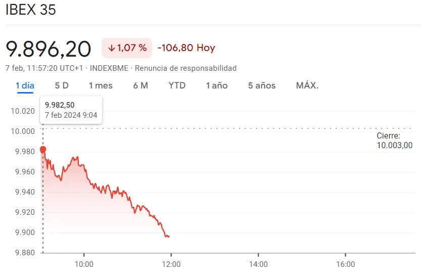 El índice Ibex 35 sin duda está atravesando un momento de pérdidas que en estos momentos no dejan lugar a ninguna subida. Está siendo una sesión caótica de unas pérdidas de hasta un 1.07%, bajándose el índice Ibex 35 unos 106.8 puntos por el índice Ibex 35. Ahora mismo las cotizaciones del índice son las de unos valores de unos 9896.2 puntos, encontrándose muy por debajo de los valores de los cierres de sesión de unos 10003 dólares (USD). El contraste lo hemos encontrado entre el máximo de unos 9982.5 puntos y lo valores mínimo de las cotizaciones actuales de uno 9896.2 dólares.