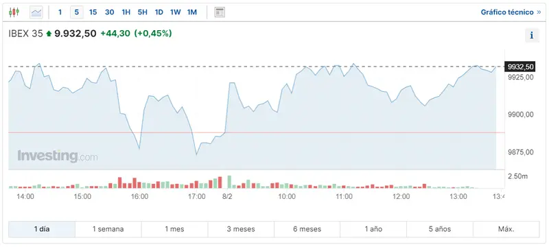 Gráfico de las cotizaciones del índice Ibex 35 en un espacio de tiempo de un día