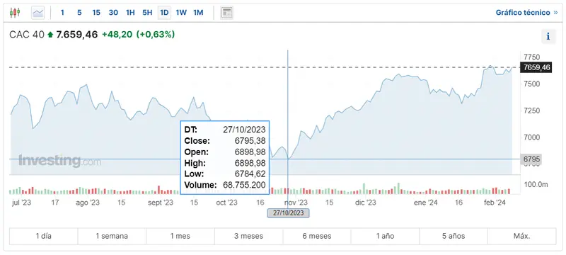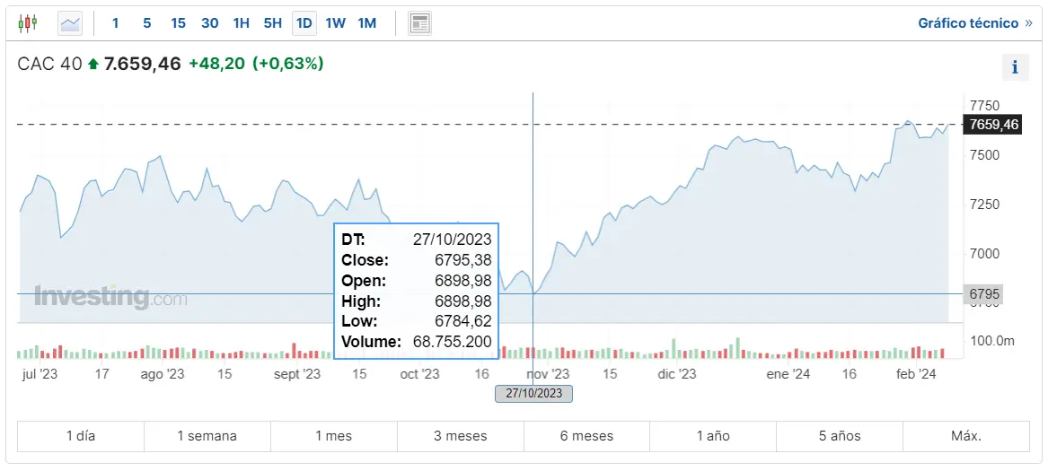 Gráfico de las cotizaciones del índice CAC 40 en un espacio de tiempo de un día