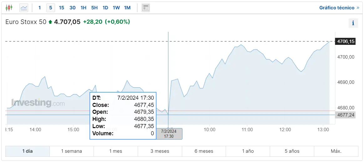 Gráfico de las cotizaciones del índice Euro Stoxx 50 en un espacio de tiempo de un día