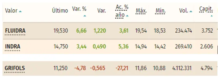 Se complica el Ibex 35 con Indra, Grifols y Fluidra, lo que apreciamos mucho en las cotizacioes de cada una de las empresas en detalle. Los valores de las tres empresas suben en algunos de los casos, bajando en el caso de otras de las empresas. Apreciamos como se sigue complicando la situación teniendo en cuenta como Indra y Fluidra se disparan mientras Grifols baja un gran nivel. ¿A qué se debe el impacto de Indra? Gran volumen frente a grandes pérdidas en las acciones Grifols y flechazo alcista de Fluidra Bolsa (6.66%)