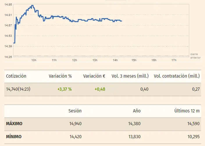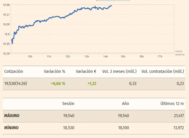 El precio que apreciamos en las acciones Fluidra queman cualquier rastro de perdidas con unas cotizaciones que aún en los cierres de ayer fichaban unas cotizaciones como las de unos 18.29 euros de los que ahora mismo no queda nada, observando las cotizaciones de estos instantes de unos 19.56 euros por acción. Todo ello es producto de unas subidas de hasta un 6.66%, creciente en unos 1.22 euros por acción entre los máximos de 19.54 y los mínimos de 18.53 euros.