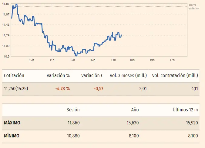 Los valores de las acciones Grifols no han hecho más que suman pérdidas recientes con sus cotizaciones de los últimos momentos, que marcaban valores de apenas unos 11.25 euros por acción. Las cotizaciones actuales son la consecuencia de las caídas de un porcentaje del 4.78% que se llevan unas pérdidas de unos 0.57 euros por acción, bajando desde los máximos y cierres de la sesión anterior de hasta unos 11.87 euros por acción. En cuanto al volumen de la empresa , lo hemos llegado a ver en unos 2.01 euros .
