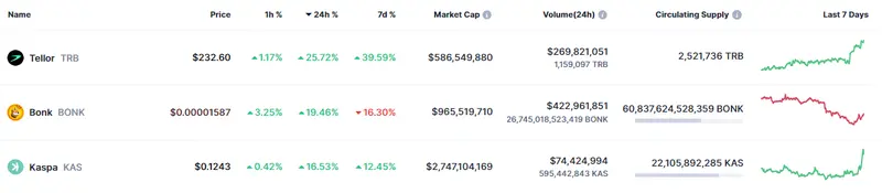 Una vez más nos hemos vuelto a ver expuestos a la enorme volatilidad que nos presenta en la sesión de hoy el precio de muchas de las criptomonedas cayendo por unos valores que se redirigen hacia unas subidas interesantes que encuentran máximos como el del precio de Tellor que se topa con el precio de 235.11 USD, mientras que observamos graves cambios en el precio de Bonk (19.46%) y el panorama del precio de Kaspa se agrava con las subidas de un 1.53%.