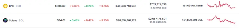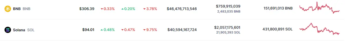Tabla con las cotizaciones de las criptomonedas BNB y Solana en un espacio de tiempo de un día