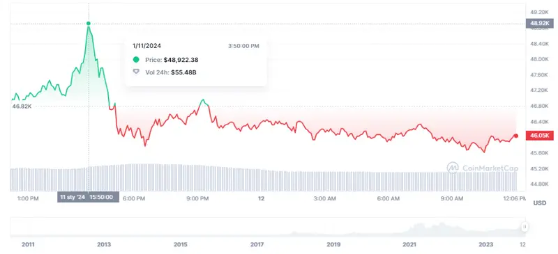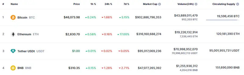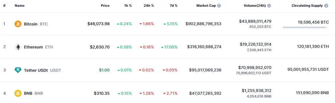 Las criptomoneda Bitcoin (BTC) ha atravesado unos momentos muy malos con sus caídas que pasan de las cotizaciones más fuertes de la sesión de hoy de unos 48.92 mil dólares, perdiéndose posteriormente el precio del Bitcoin en valores de apenas unas cotizaciones de 45.6 mil dólares (USD). Lo que hemos visto en el mercado de las criptomonedas, el precio del Bitcoin nos ha dado unos resultados de alzas del 5.15% semanales que contrastan con las caídas de un 1.66% en las últimas 24 horas, subiendo en la última hora apenas un 0.24%.