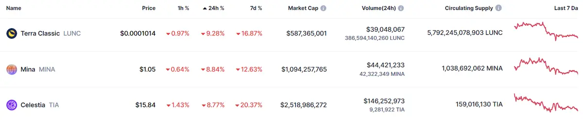 Fuerte declive del 9.28% en el precio de Terra Classic con caídas en el precio de Mina y el precio de Celestia