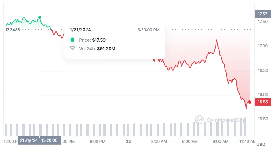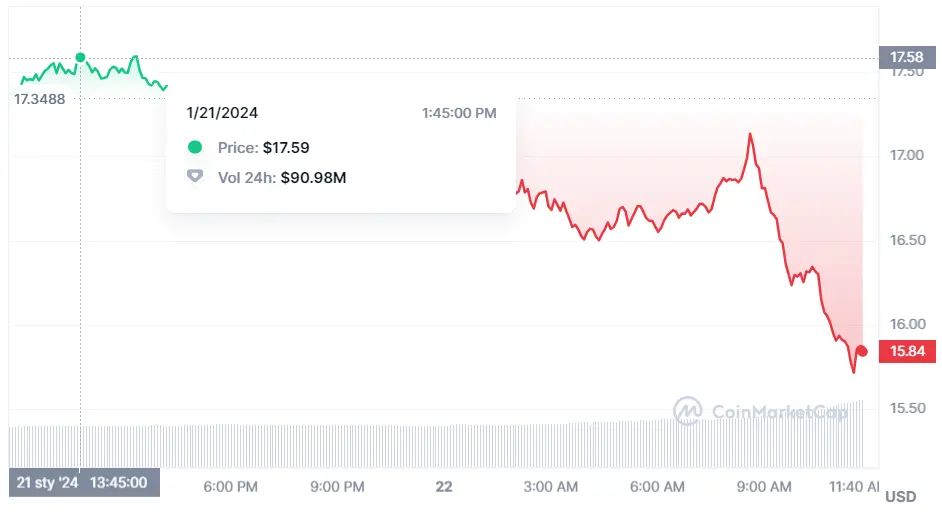 El precio de Terra Classic está en estos momentos en unas cotizaciones que pierden desde las cotizaciones máximas de unos niveles de unos 17.58 dólares hacia los valores mínimos que en estos momentos nos vemos ante unos valores muy bajos de apenas unos 15.75 dólares (USD). El precio de esta criptomoneda ha bajado con gran impacto, cotizando en estos instantes unas cotizaciones actuales de unos 15.84 dólares por unidad de la criptomoneda. Estos momentos nos situan en unas continuas caídas que avanzan en las caídas de un 9.28% en las últimas 24 horas bajando en los últimos 7 días en un 16.87%.