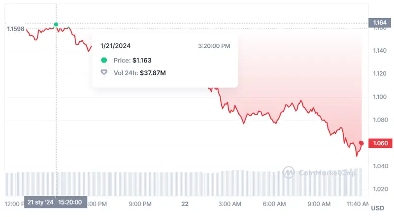 Las cotizaciones de la criptomoneda Mina se han derrumbado encontrándose ante unas fuertes caídas que parten de unos niveles muy altos como los de unos máximos de hasta unos 1.164 dólares. Desde las cotizaciones máximas, la criptomoneda Mina encuentra sus valores mínimos en unas cotizaciones de unos 1.05 dólares. En este momento el precio de la criptomoneda Mina cae por los actuales 1.06 dólares, bajando un 8.84%, con caídas semanales del 12.63% y una caídas de los últimos momentos de un 0.64%.