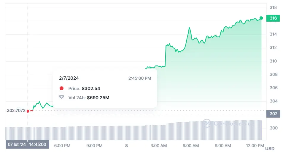 Las direcciones de Binance se mantuvieron por encima de los 420 millones, mientras que BNB ha estado tratando de mantenerse en el rango de precios de 300 dólares. La cadena inteligente de Binance ha asegurado una posición destacada en métricas clave, generando dudas sobre su valor total bloqueado y la tendencia de BNB. Binance ha mantenido el liderazgo en términos de direcciones únicas, superando los 400 millones tanto en enero como en febrero, y ocupando el cuarto lugar en cantidad de transacciones en el último mes. Aunque ha experimentado una disminución en la actividad reciente, la cantidad de direcciones activas sigue siendo alta. BNB ha luchado por mantenerse dentro del rango de precios de 300 dólares, con fluctuaciones menores en su valor reciente, cotizando alrededor de 302 dólares al momento de escribir este artículo.