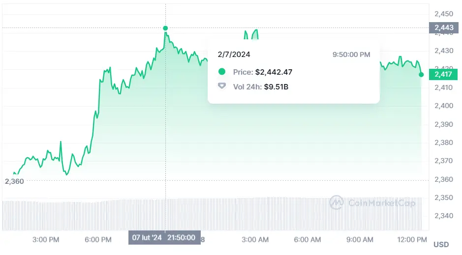 Gráfico de las cotizaciones de la criptomoneda Ethereum en un espacio de tiempo de un día