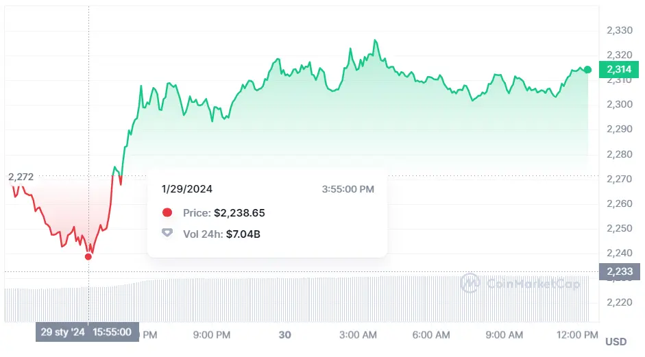 Las cotizaciones de este momento en el caso de Ethereum están en un momento de lo más alcista con sus cotizaciones de este instante que se vienen mostrando por unas cotizaciones de unos 2.314 dolares por unidad de Ether (ETH). Las cotizaciones más llamativas del precio del Ethereum de la sesión de hoy son tambien los valores mas bajos que nos hemos llegado a encontrar en apenas unos 2.233 dólares por Ethereum.