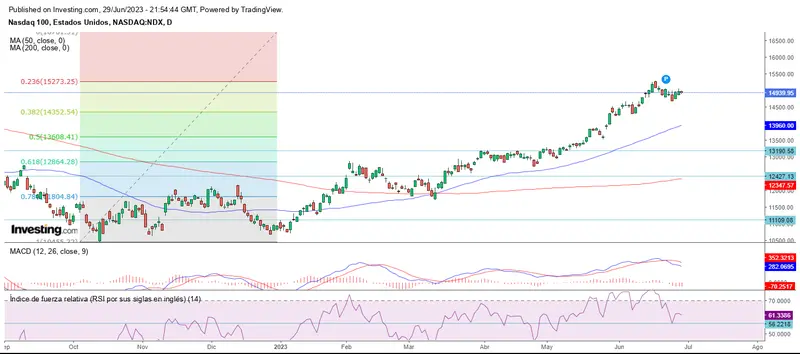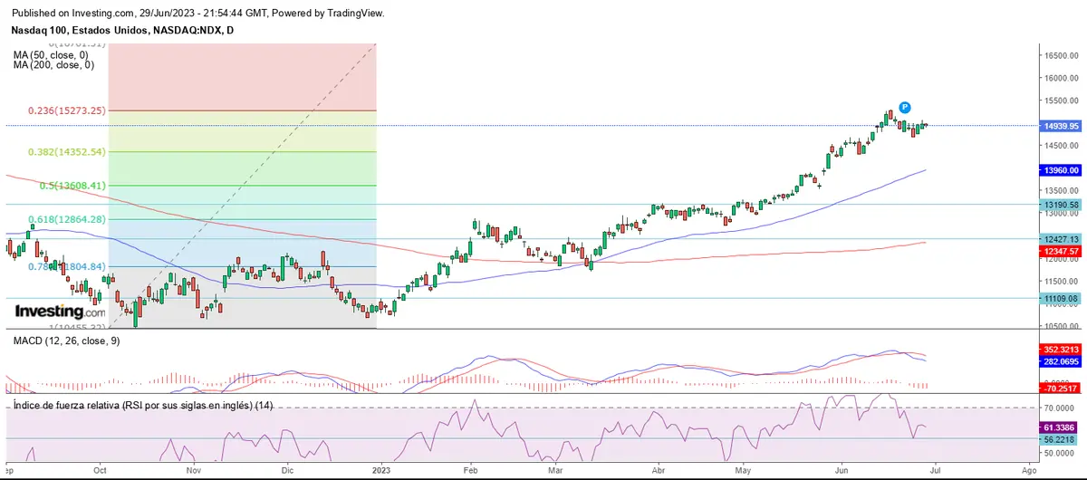 El Nasdaq se mantuvo toda la semana debajo del 23.60% de Fibonacci, cerrando la penúltima sesión semanal en los 14.939 puntos.