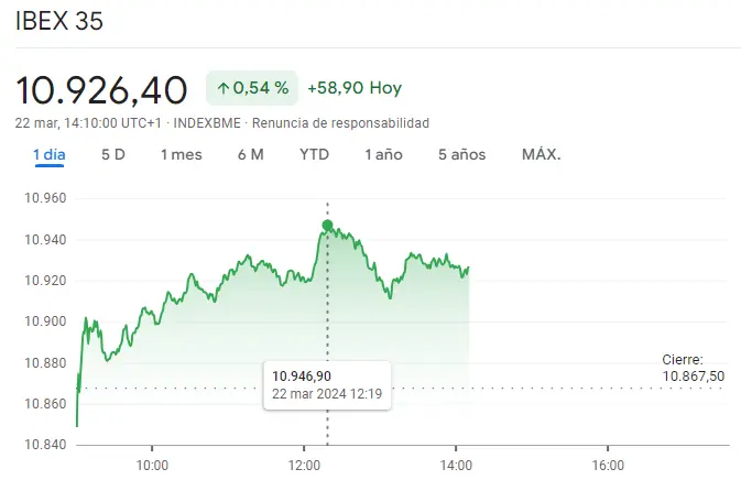 El índice Ibex 35 está atravesando una buena sesión, sobre todo teniendo en cuenta las subidas que se va observando en los últimos momentos. En este instante el índice de la Bolsa de Madrid crece unas cotizaciones de unos 58.9 puntos, arrastrando sus valores en un 0.54% hasta las cotizaciones actuales de unos niveles de unos 10926.4 puntos por el índice, sumando en todo momento cotizaciones por encima de los valores del cierre de la sesión de ayer de 10867.5 puntos.