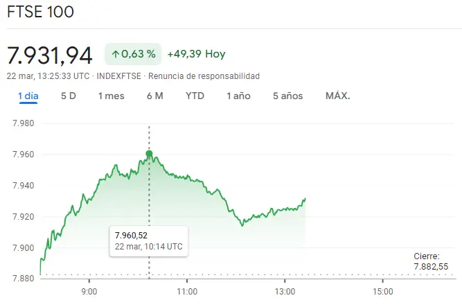 La sesión de hoy no ha dejado una vez más ante varias escaladas en el mercado británico, un mercado que recientemente se veía muy afectado por los datos procedentes del Banco de Inglaterra. Podemos encontrar unas cotizaciones bastante motivadas por las crecientes de unos 49.39 puntos por el índice, elevándose ahora mismo las cotizaciones del mismo en un 0.63% hasta alcanzar las cotizaciones de unos 7931.94 puntos. Entre los vistos hoy, señalamos también los niveles del cierre de la sesión de ayer de valores de unos 7882.55 puntos, que contrastan mucho con las cotizaciones de los máximos de la sesión de hoy de unos valores de 7960.52 puntos.