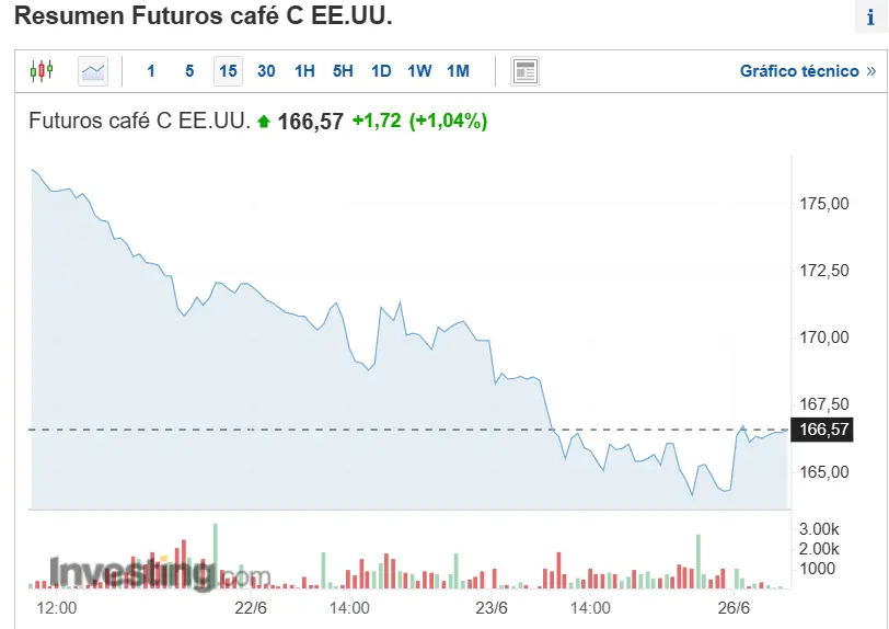 Los futuros del café tienen una cotización actual de 166,57 dólares tras haber vivdo un alza del 1,04 % lo que le lleva a ganar 1,72 dólares.