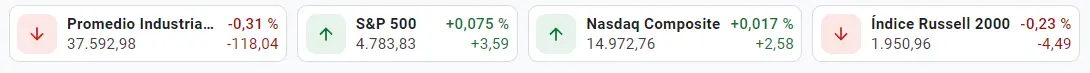 El índice más bajista de los activos que componen el merecado de Wall Street es el de Dow Jones, con unas caídas tan fuertes como las de un 0.31%, perdiendo unos valores de unos 118.04 puntos, bajando el índice desde los 37818.05 puntos hacia las cotizaciones de unos valores de unos 37490 puntos, bajando el índice Dow Jones hacia las cotizaciones de unos valores de 37592.98 puntos por el índice. A lo largo de la última sesión, el índice Dow Jones se ha mantenido por debajo de los valores del cierre de la sesión de unos 37711.02 puntos.
