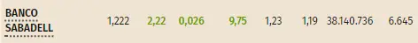Las cotizaciones que las acciones Sabadell del mercado español nos dejan son más bajistas de lo que podíamos esperar, observando como sus niveles van avanzando hacia unos niveles de interés de subida, ganando sus niveles en un 2.22%, topándose con unos máximos que cotizan hasta unos 1.233 euros por acción, subiéndose por los valores actuales de unos 1.22 euros mientras que las cotizaciones mínimas las acciones Sabadell las hemos visto en valores de apenas unos 1.19 euros.