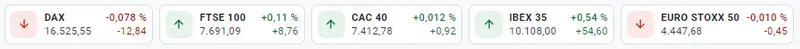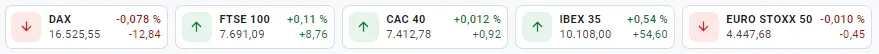 Tabla con los datos de las cotizaciones de los índices europeos en un espacio de tiempo de un día