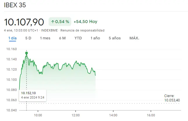 Ahora mismo las cotizaciones de algunos índices como el índice Ibex 35 siguen creciendo en unos valores que siguen apuntando hacia unos valores de alzas. Ahora mismo el índice Ibex 35 sube un valor exacto de unos valores de 54.5 puntos con alza de unas cotizaciones del 0.54%. Ahora mimo estamos viendo como las cotizaciones del índice Ibex 35 está perdiendo un poco desde las cotizaciones de los máximos de hasta 10152.1 puntos, cayendo a lo actuales 10107.9 puntos. Aún así, las cotizaciones del índice Ibex 35 siguen por encima de los cierres de sesión de ayer en 10053.4 puntos.