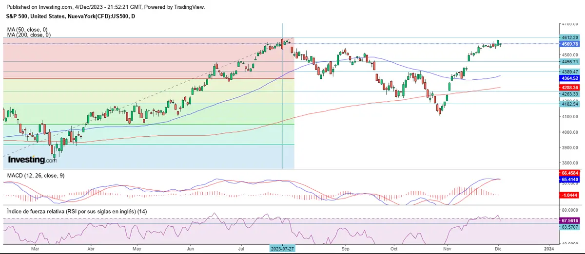 1. El S&P 500 nos dejan un retroceso tras la vela del viernes, quedando unos pasos por encima de la apertura del cierre de la semana pasada en los 4.569 puntos.