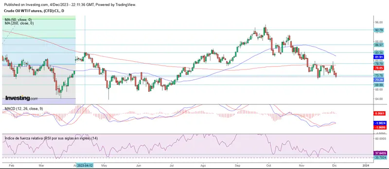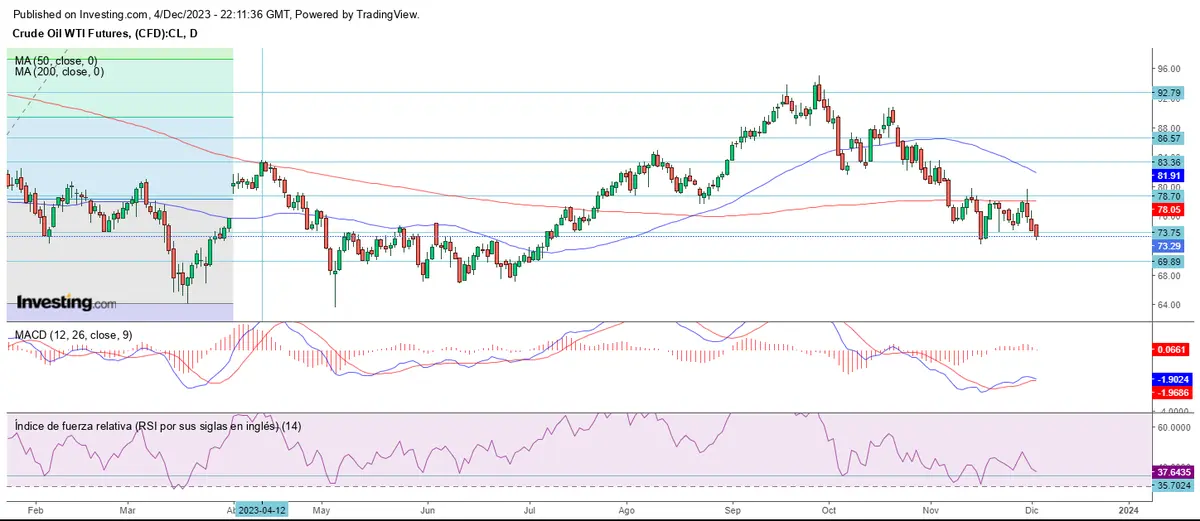 El crudo WTI esta nuevamente en manos de los osos al romper este lunes nuevamente el soporte en los 73.75 dólares, cotizando unos centavos menos del mismo en el cierre del lunes.