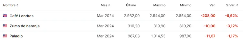 Tabla con las cotizaciones de las materias primas más volátiles del mercado de valores