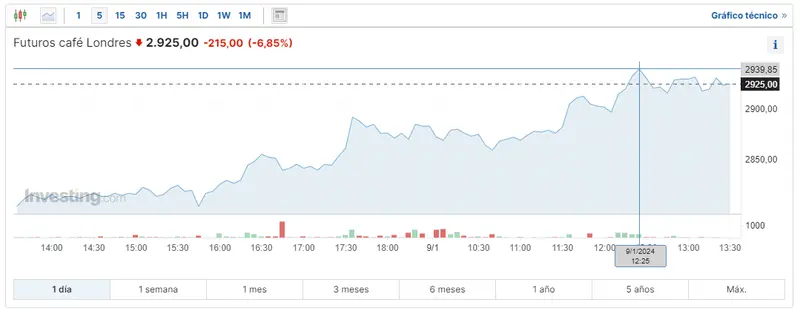 Gráfico de las cotizaciones del café en un espacio de tiempo de un día