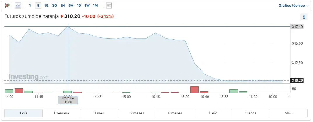 Gráfico de las cotizaciones del zumo de naranja en un espacio de tiempo de un día