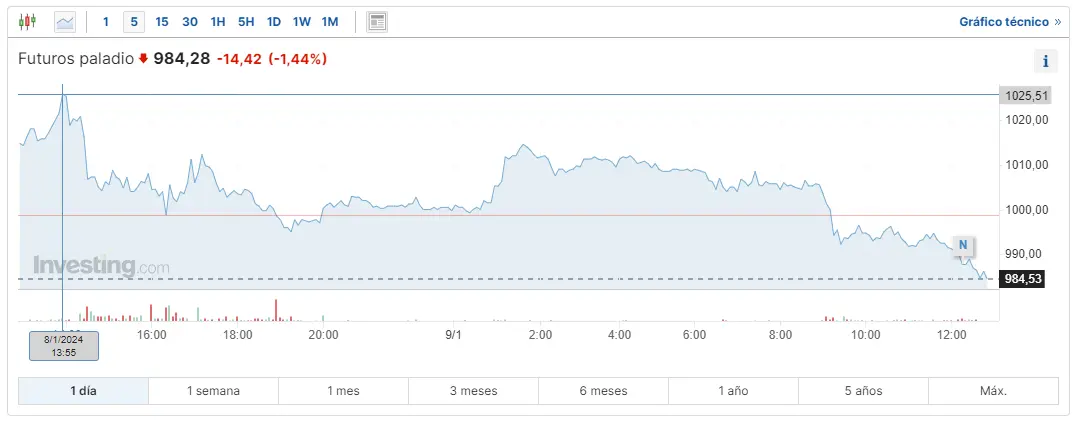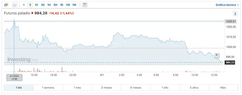 Gráfico de las cotizaciones del paladio en un espacio de tiempo de un día
