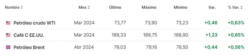Tabla con las cotizaciones de las materias primas más volátiles del mercado