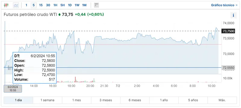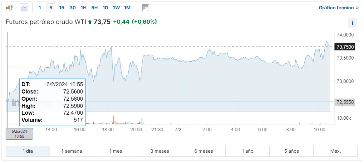 Gráfico de las cotizaciones del petróleo crudo WTI en un espacio de tiempo de un día